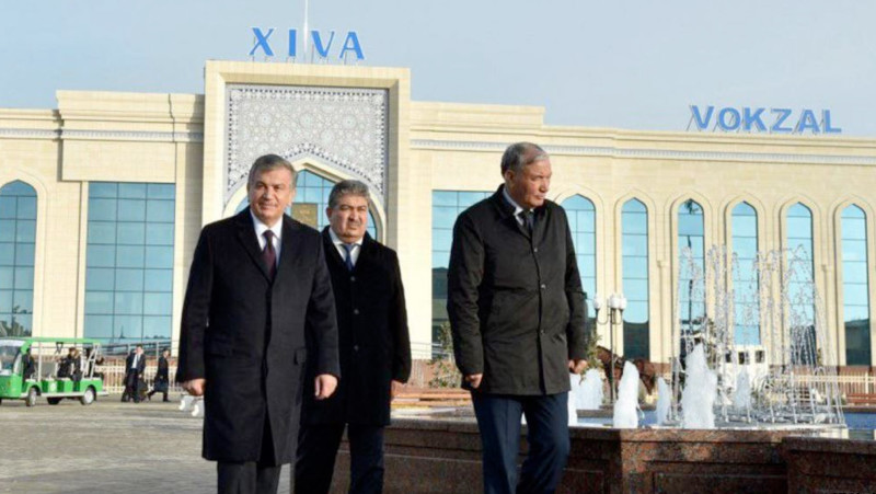 Шавкат Мирзиёев с Ачилбаем Раматовым (в центре) на вокзале в Хиве. Фото пресс-службы президента Узбекистана