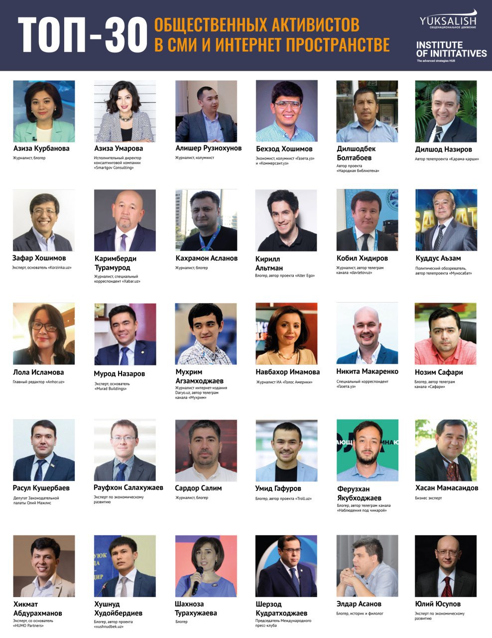 Общенациональное движение «Юксалиш» («Развитие») и Институт социальных и экономических инициатив составили список самых заметных общественных активистов Узбекистана, куда вошли наиболее авторительные общественные деятели, в том числе журналисты, независимые эксперты и блогеры. Список представлен в Telegram-канале движения.