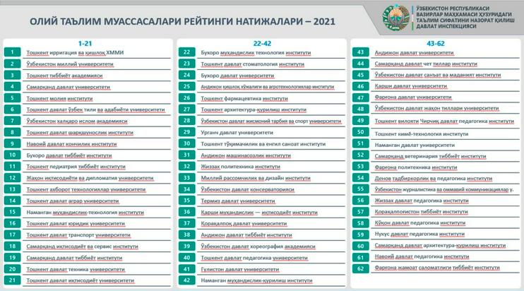 Худшим вузом признан Ферганский медицинский институт общественного здоровья, который был создан постановлением президента от 3 декабря 2020 года. В минорную десятку вошли еще восемь институтов и один университет — это Университет журналистики и массовых коммуникаций Узбекистана.