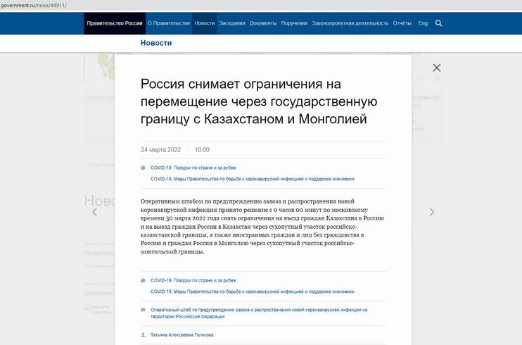 «Оперативным штабом по предупреждению завоза и распространения новой коронавирусной инфекции принято решение с 0 часов 00 минут по московскому времени 30 марта 2022 года снять ограничения на въезд граждан Казахстана в Россию и на выезд граждан России в Казахстан через сухопутный участок российско-казахстанской границы, а также иностранных граждан и лиц без гражданства в Россию и граждан России в Монголию через сухопутный участок российско-монгольской границы», — говорится в сообщении.